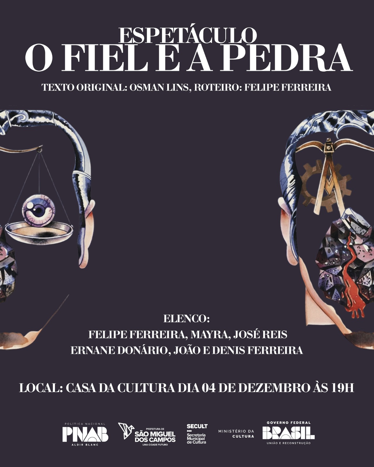 Já na quinta-feira, 4 de dezembro, a programação começa mais cedo: às 14h, com a divertida peça “O Rapto das Cebolinhas”, voltada especialmente ao público infantil. O encerramento será às 19h, com o “Espetáculo O Fiel e a Pedra”, proporcionando mais uma noite de arte e cultura.