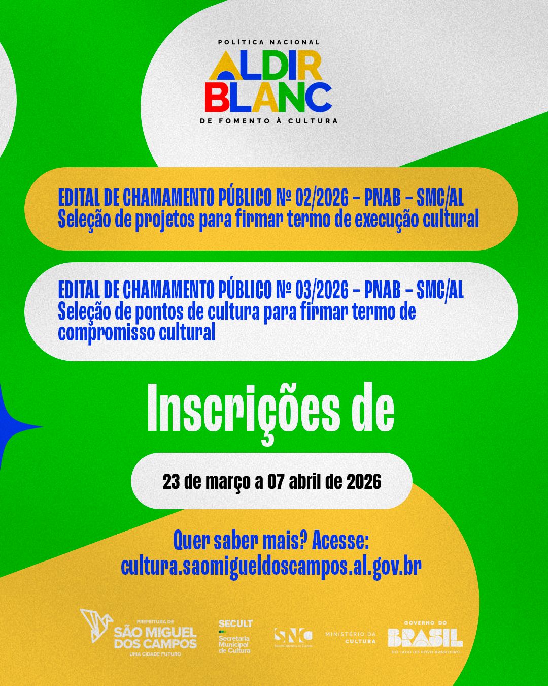 A Prefeitura de São Miguel dos Campos/AL, por meio da Secretaria Municipal de Cultura, realizou o lançamento dos editais da Política Nacional Aldir Blanc de Fomento à Cultura – PNAB (Lei nº 14.399/2022), consolidando mais um importante avanço nas políticas públicas voltadas ao fortalecimento do setor cultural no município. A iniciativa integra as ações estratégicas da gestão municipal voltadas à promoção da cultura, garantindo acesso democrático aos recursos públicos e incentivando a produção artística em suas diversas linguagens. Com a implementação da PNAB, São Miguel dos Campos passa a executar recursos federais destinados ao fomento cultural, assegurando investimento direto em projetos, grupos, coletivos e instituições culturais. A medida amplia as oportunidades para os fazedores de cultura e contribui para o desenvolvimento econômico, social e cultural da cidade. Nesta etapa, foram lançados dois editais: o Chamamento Público nº 02/2026 – PNAB – SMC/AL, voltado à seleção de projetos culturais para celebração de Termo de Execução Cultural, e o Chamamento Público nº 03/2026 – PNAB – SMC/AL, destinado à seleção de pontos de cultura para celebração de Termo de Compromisso Cultural. Os editais contemplam diversas áreas culturais, promovendo a valorização da diversidade e o fortalecimento das expressões culturais presentes no município. As inscrições estarão abertas até 07 de abril de 2026, e os interessados devem acessar o site oficial da Secretaria Municipal de Cultura, por meio do endereço cultura.saomigueldoscampos.al.gov.br, onde estão disponíveis todas as informações, orientações e documentos necessários para participação. Com essa iniciativa, a gestão municipal reafirma seu compromisso com a valorização da cultura como instrumento essencial para o desenvolvimento humano e social. A execução da Política Nacional Aldir Blanc em São Miguel dos Campos fortalece o papel do poder público na promoção de oportunidades, na democratização do acesso aos recursos e no incentivo à criatividade, contribuindo para a construção de uma sociedade mais justa, inclusiva e culturalmente ativa.